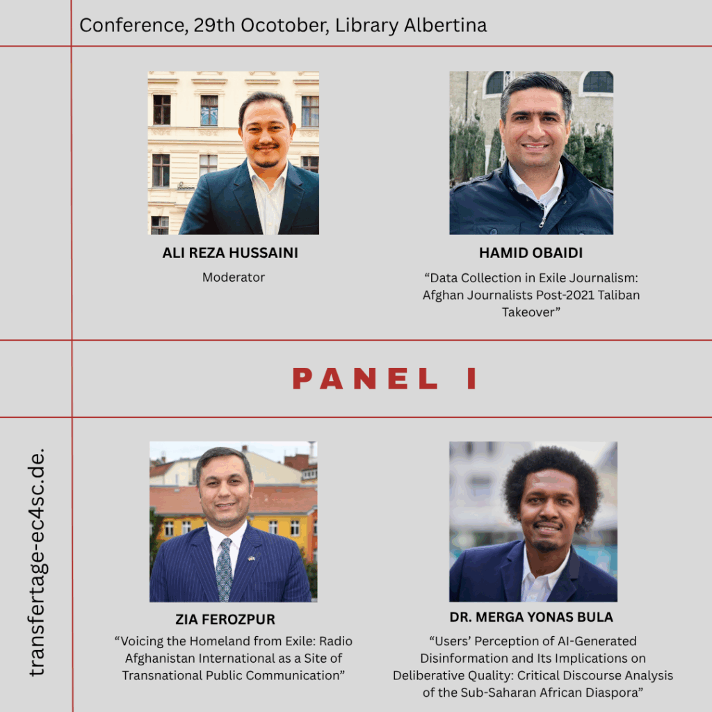 We’re excited to introduce the speakers for our first panel, moderated by PhD candidate Ali Reza Hussaini. The session brings together diverse perspectives on journalism, media, and communication across borders and in exile.